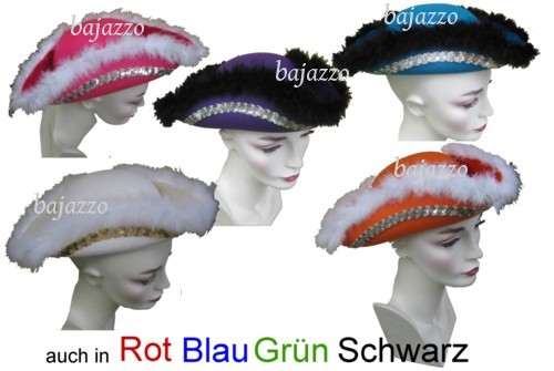 In den Größen 55, 57 + 59 lieferbar. Rot, schwarz, blau, Grün und Weiß. Federfarbe und Paillettenband frei wählbar.