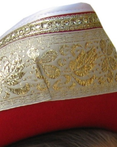 Die Litze kann anders sein, als hier auf dem Foto.Nicht immer können wir jahrelang die gleiche Litze nachkaufen.Das breite Band wird mit kleinen Fältchen aufgenäht.Das ist kein Reklamationsgrund.