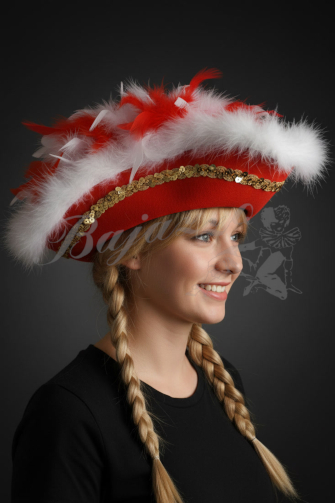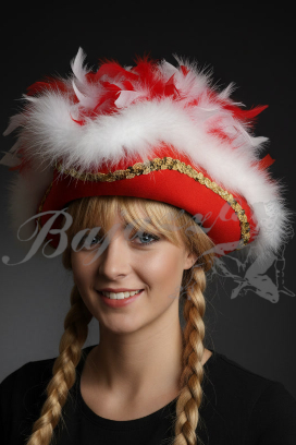 Der weiße Pelzbesatz verleiht dem Dreispitz eine besonders luxuriöse Optik. Geschmückt wird er zusätzlich mit roten und weißen Federn sowie einem goldenen Pailletenband, das für funkelnde Akzente sorgt.