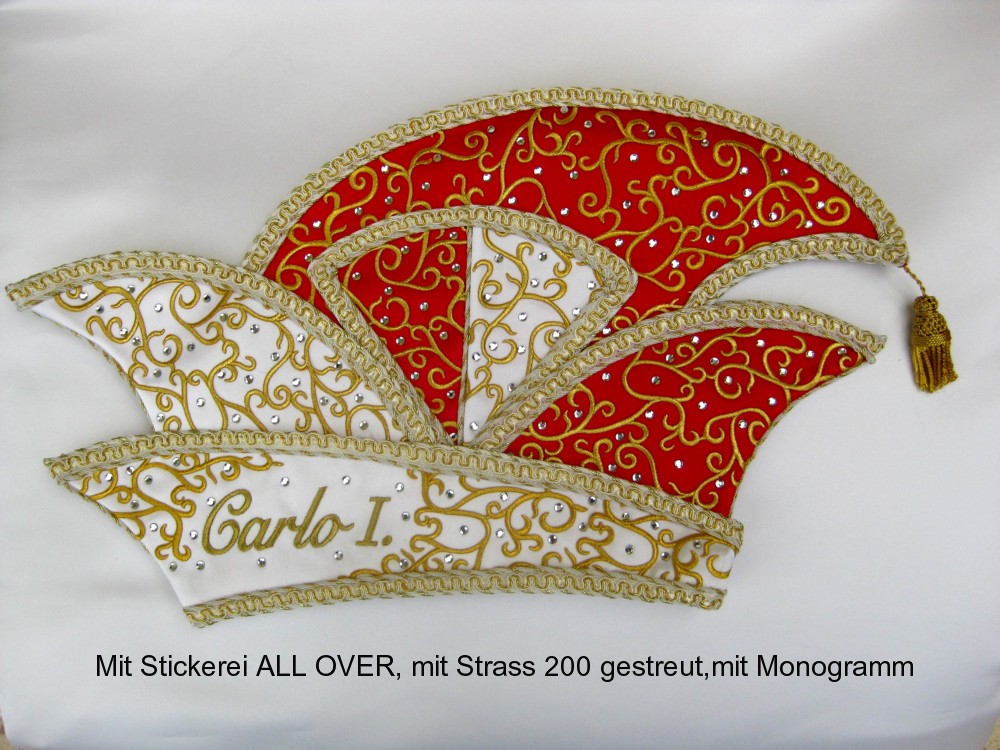 Prinzenmütze rot-weiß sind Bestandteil der Vereinskleidung. Da die Vereine ihre ganz speziellen Vorstellungen haben, fertigen wir alle Prinzenmütze rot-weiß nach Absprache mit den Kunden. Dabei kommen für alle Prinzenmütze rot-weiß verschiedene Farbkombinationen vor. Auch die Frage, ob mit Godldlitze oder Silberborde muß geklärt werden Prinzenmütze rot-weiß werden viele Jahre getragen und sind ein Aushängeschild des Vereins. Wir verwenden für unsere Prinzenmütze rot-weiß um unsere Kunden Neues anzubieten. Viele schöne Detaills zeichen unsere Prinzenmütze rot-weiß aus. Stickereien lassen wir speziell für die Prinzenmütze rot-weiß anfertigen. Wertvolle Borden und Bänder importieren wir aus der ganzen Welt. Wunderschöne Strasssteine vervollständigen die tolle Optik unserer Prinzenmütze rot-weiß