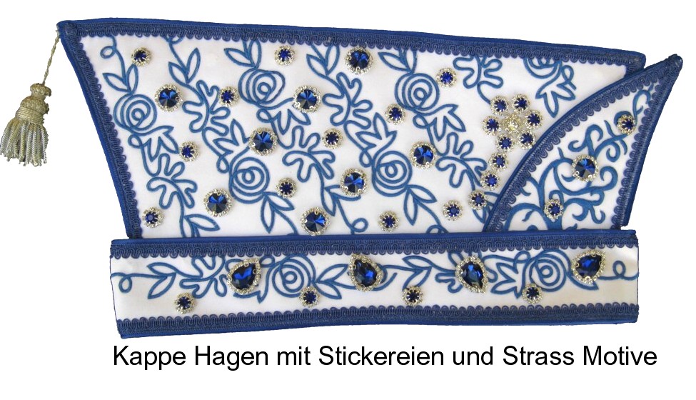 Komiteemütze weiß blau sind Bestandteil der Vereinskleidung. Da die Vereine ihre ganz speziellen Vorstellungen haben, fertigen wir alle Komiteemütze weiß blau nach Absprache mit den Kunden. Dabei kommen für alle Komiteemütze weiß blau verschiedene Farbkombinationen vor. Auch die Frage, ob mit Godldlitze oder Silberborde muß geklärt werden Komiteemütze weiß blau werden viele Jahre getragen und sind ein Aushängeschild des Vereins. Wir verwenden für unsere Komiteemütze weiß blau um unsere Kunden Neues anzubieten. Viele schöne Detaills zeichen unsere Komiteemütze weiß blau aus. Stickereien lassen wir speziell für die Komiteemütze weiß blau anfertigen. Wertvolle Borden und Bänder importieren wir aus der ganzen Welt. Wunderschöne Strasssteine vervollständigen die tolle Optik unserer Komiteemütze weiß blau