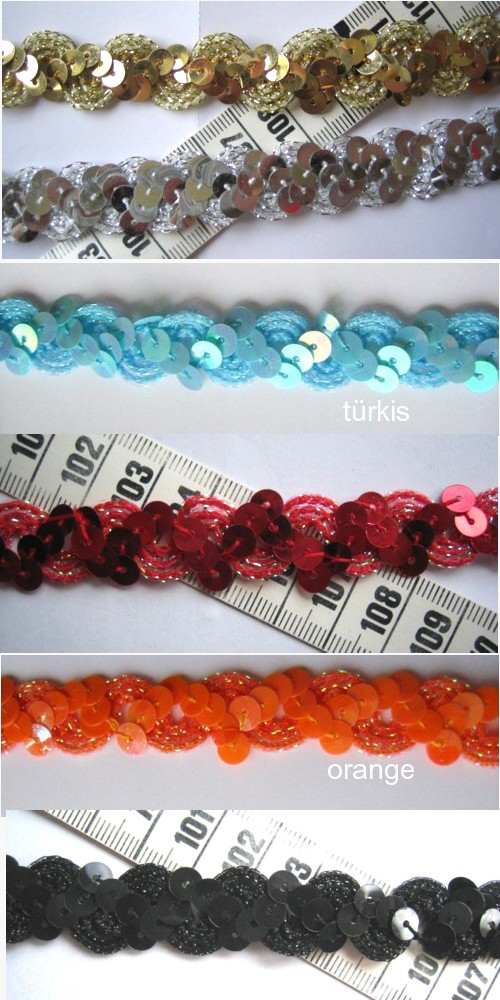 Bei elastischen Stoffen werden dann Flitterband verwendet , damit sich das Band dem Stoff anpassen kann Elastische Paillettenbordenpassen sich jeder Bewegung an .Flitterband gibt es in vielen Farben und wird immer beliebter.