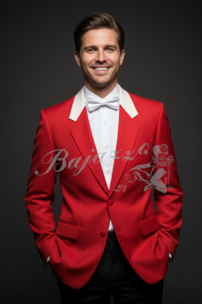 Herrenjacke rot. Revers rot. Kragen weiß. Mit zwei Klappentaschen. Gefüttert. Klassischer Wollgabardine