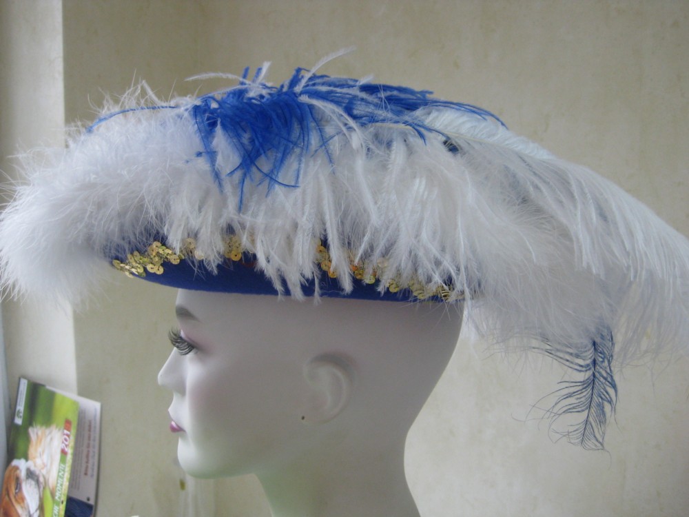 Achtung, die Federn sind kürzer als auf dem Foto, ragen ca 10 über die hintere Hutkante hinaus