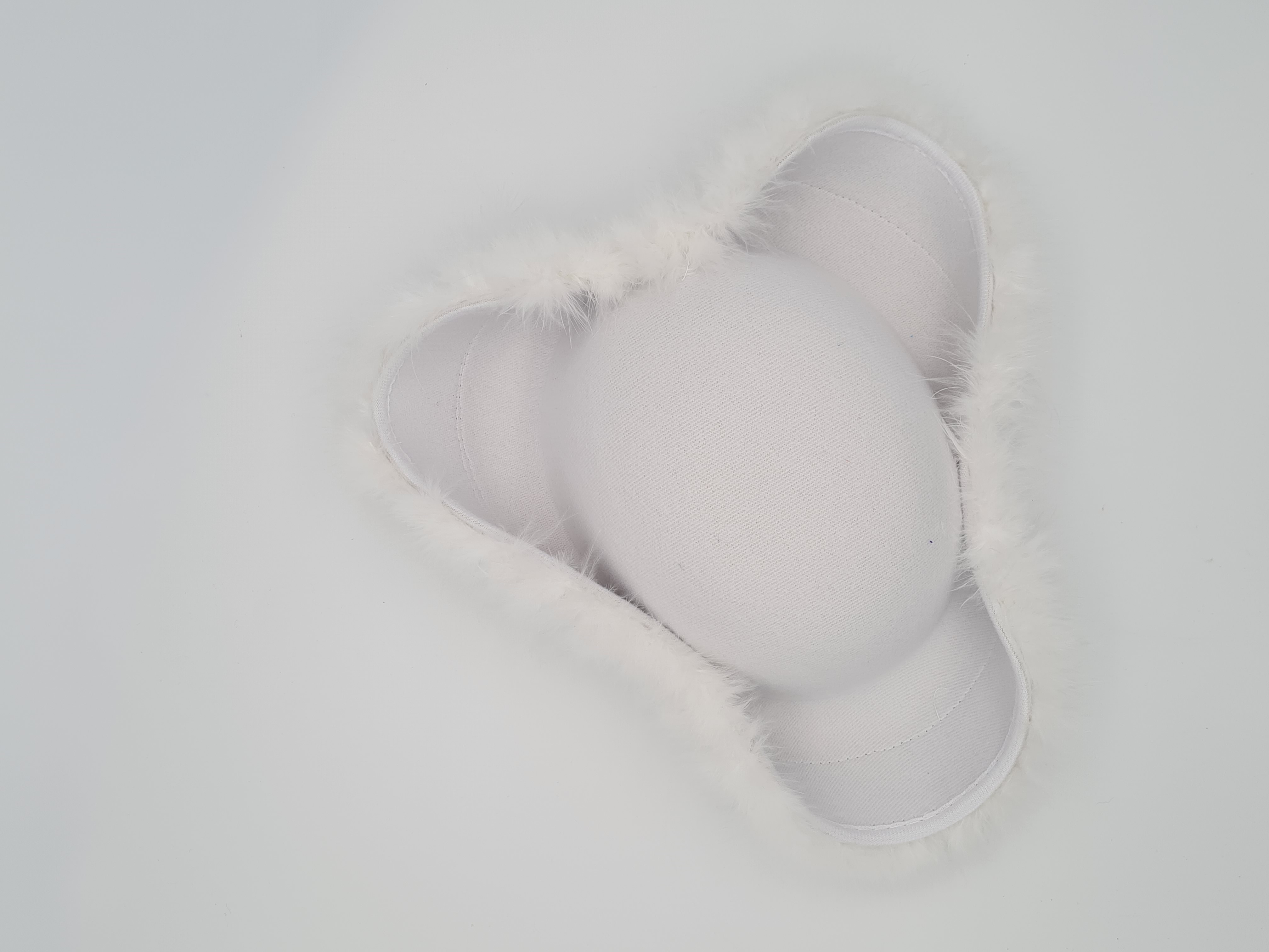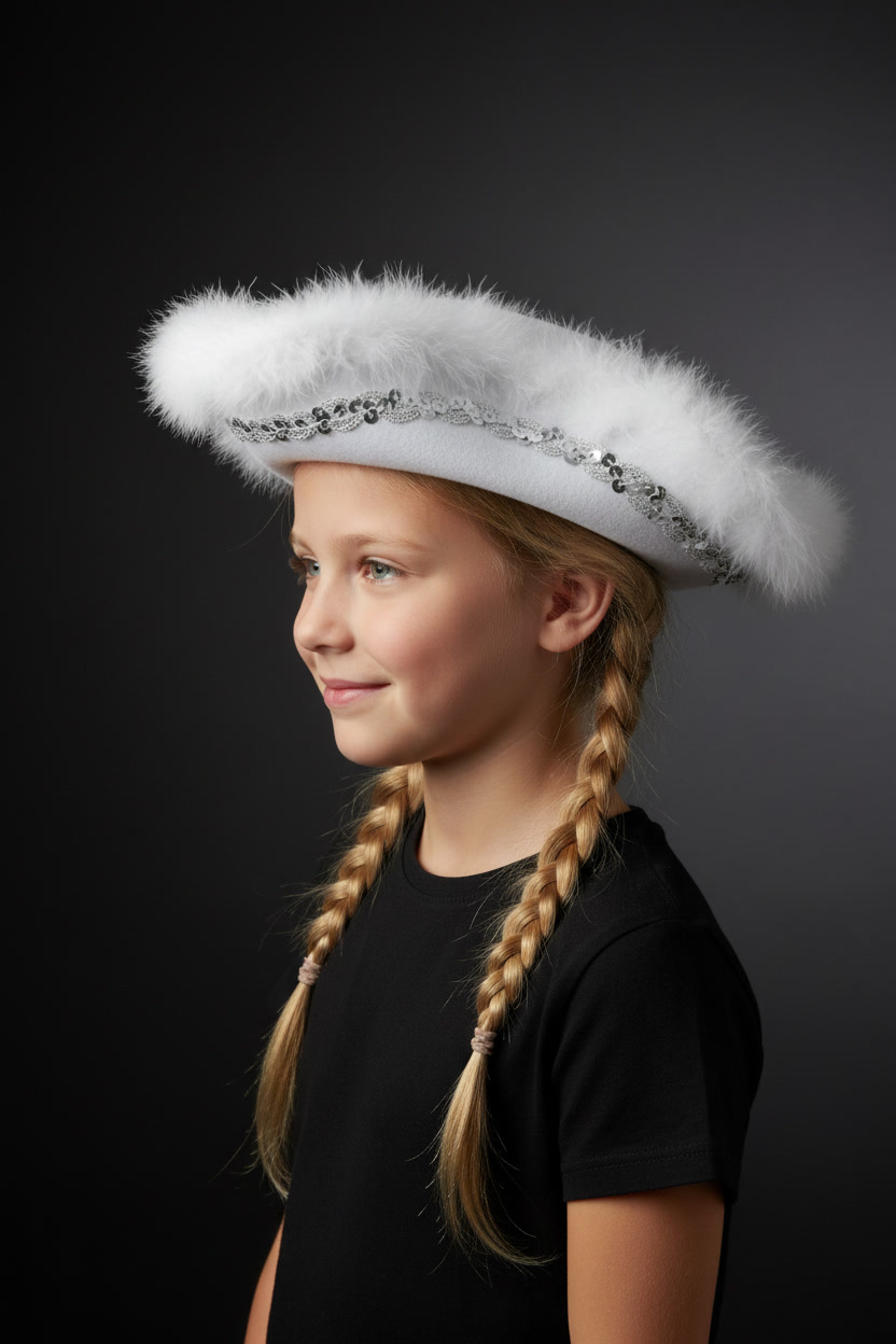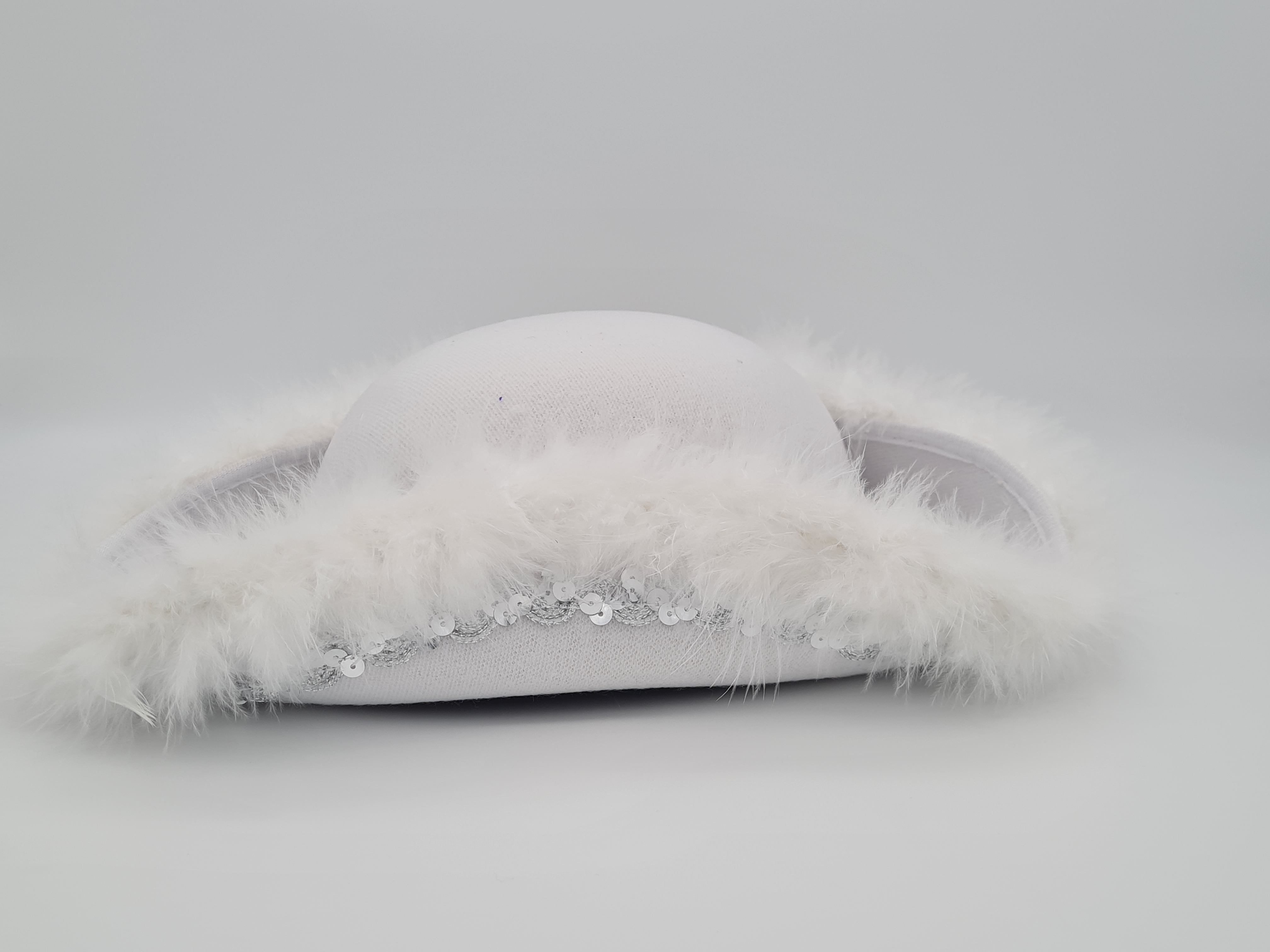 Verleihen Sie Ihrem Kostüm einen klassischen und eleganten Touch mit diesem wunderschönen weißen Mariechenhut. Der Hut ist mit flauschigem Marabout-Besatz verziert, das dem Design eine edle Note verleiht. Ein funkelndes silbernes Paillettenband rundet den Look perfekt ab und sorgt für einen glamourösen Auftritt.